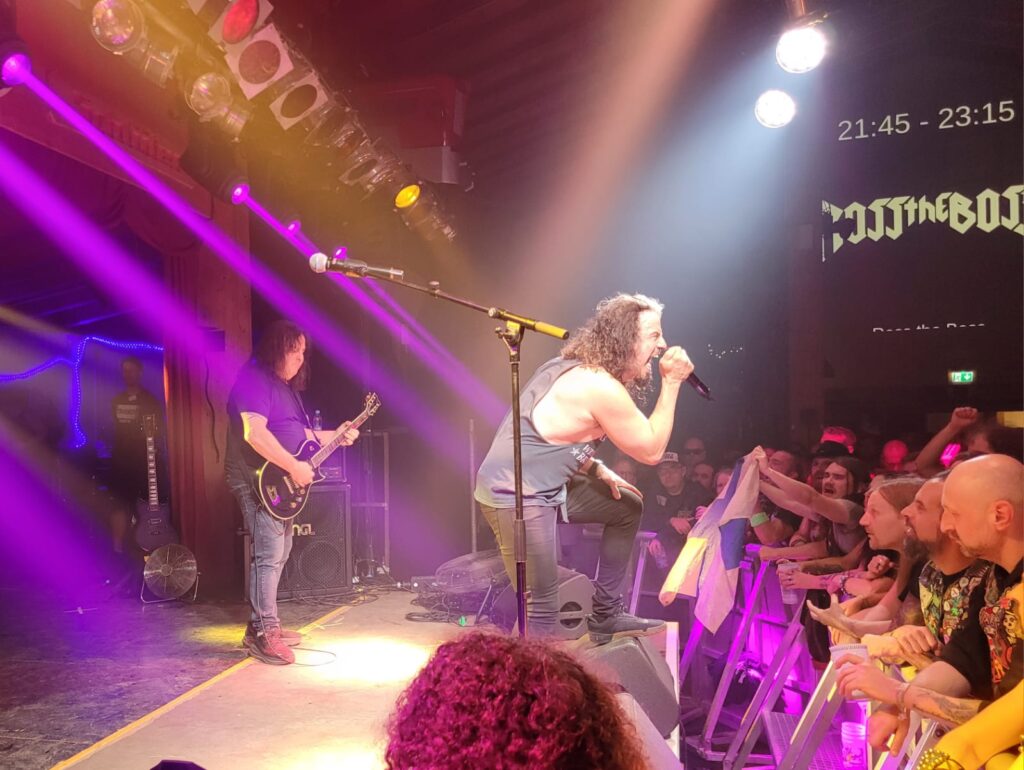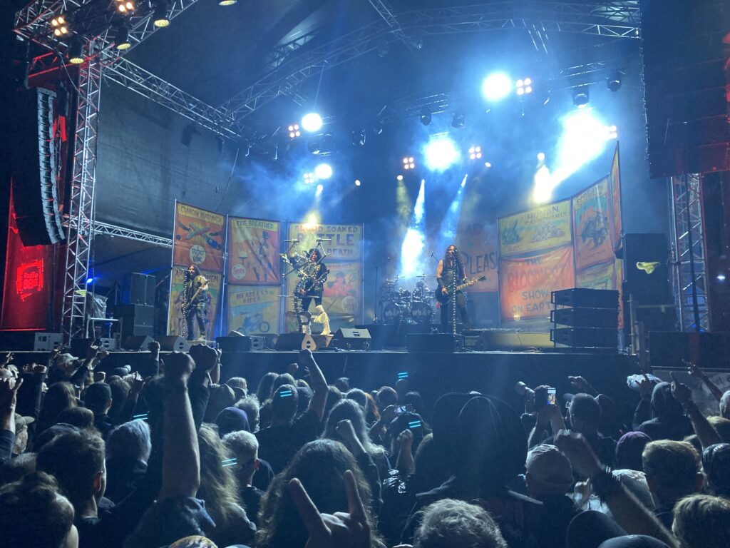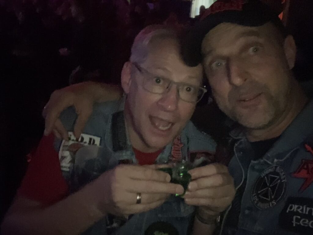 ……und während das Nova Rock noch läuft, starten weitere Legenden der Metal Front nach München zu Exodus und nach Ludwigsburg ( Badda ) zu King Diamond💪💪🤘Battle Creek, Thrasher aus dem Chiemgau heizen ein und das ziemlich gut💪🤘Merch Stand, Pflichttermin!🙈😂der Gewinner unter den Designs am Standl🔥🔥🔥…….und dann gehts gleich los mit Sacred Reich in der Sauna Backstage🥵😂🤘🤘Sacred Reich mit Urshouter Phil Rind legen gleich mit ‚the American Way‘ los und ab gehts im Backstage!💪💪🤘🤘richtig, richtig geiler Gig und bei ‚Surf Nicaragua‘ drehen sowieso alle durch!💣💣💣 geiiiiiiiiil!🤘🤘kurze Verschnaufspause auf dem gemütlichen Backstage Gelände!….. noch ein Bier und dann extrem abschwitzen bei Exodus🤘der fiese Rob Dukes ersetzt Steve ‚Zetro‘ Souza am Mikro! Fies aber geil😂😂Tom Hunting zerlegt wie immer seine Schießbude😳💣 🥁 Urgestein, Gary Holt, direkt vor uns an der Gitarre💪Ein Hochgeschwindigkeitsriff jagt das nächste! Kompletter Wahnsinn die Jungs! das war Elite Thrashmetal vom feinsten heute! Mercy👌💣🎸