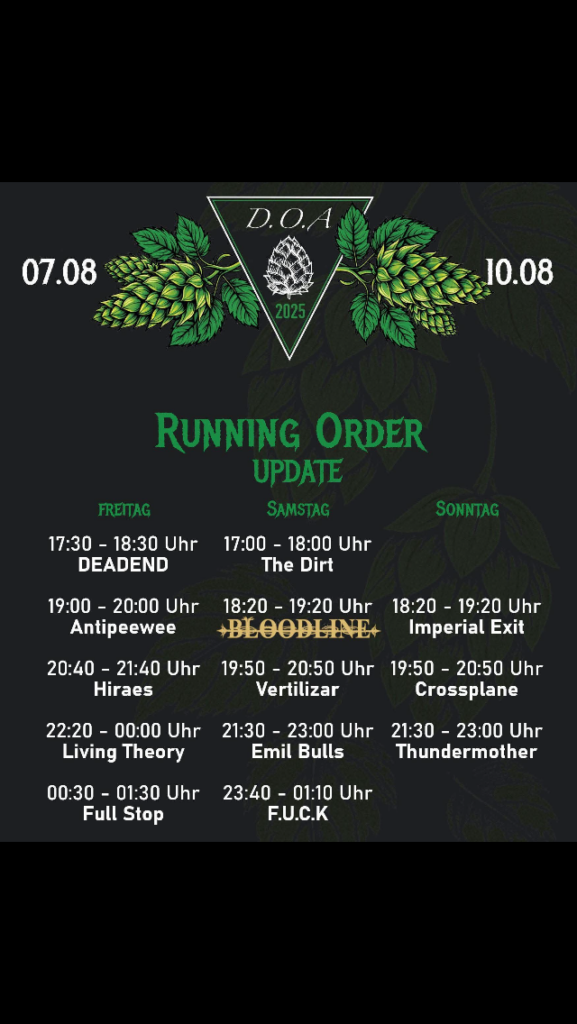 so schaut’s aus heuer! Absolutes Schmankerl, Heimspiel und ein Must have🤘🤘🤘❤️Antipeewee, ebenfalls Heimspiel und sowas von geil, die Abensberger Thrash Maschine!💪🤘🤘die Holledauer Metal Buam mit der Metal Front Holledau und dem Sekretär vom Mainburger Rotary Club😜🤘🤘🤘 ( es fehlt der Helm vom Harry und der Harry )Metal Front Camper aus Passau, leider mit Scheiß Nachbarn, rücksichtslos und ein beschissener Musikgeschmack! DAS muss besser werden. Camping Ground only for Metal Heads, Doiboch☝️Antipeewee!💪💪💪💪Crossplane aus dem Pott!…….gemütlicher Ausklang bei Thundermother!🤘